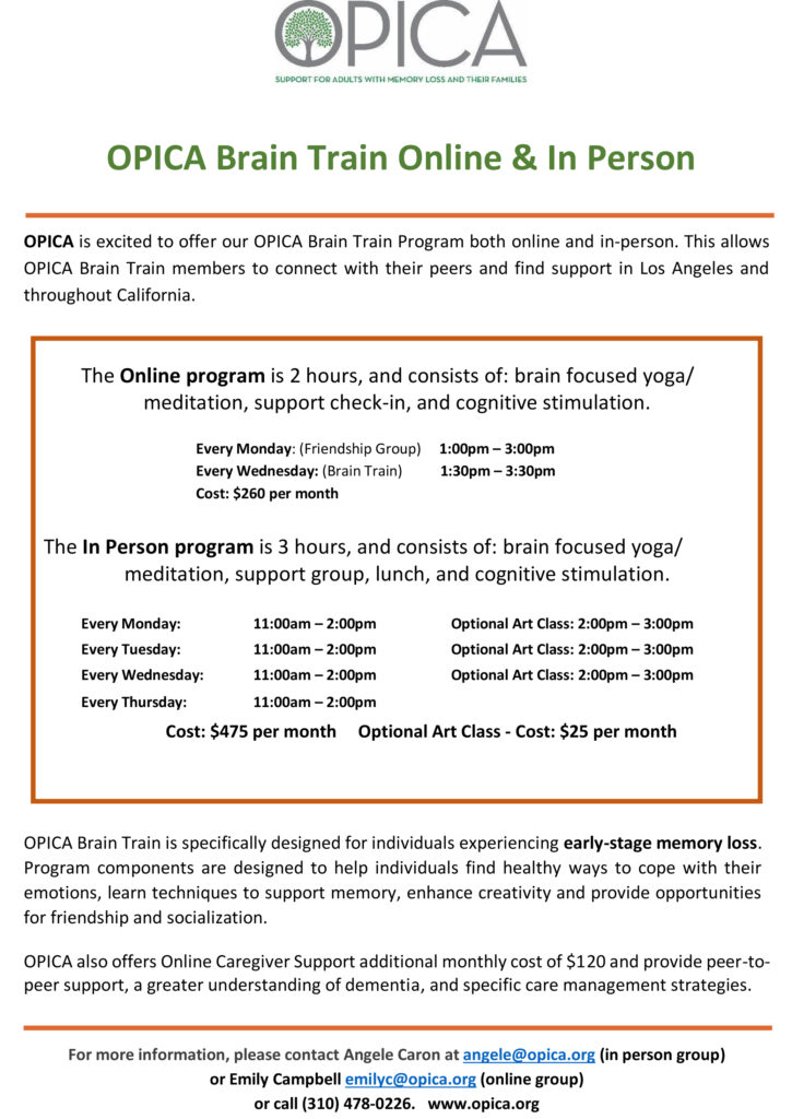 OPICA Brain Train – Virtual For in-person contact Angele Caron at angele@opica.org For online contact Emily Campbell at emilyc@opica.org Or call (310) 478-0226www.opica.org