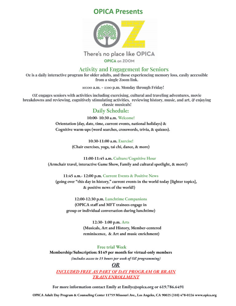OZ – OPICA on Zoom, is a daily interactive program for older adults, and those experiencing memory loss, easily accessible from a single Zoom link. OZ engages seniors with activities including exercise, cultural adventures, cognitive activities, art activities, and musical engagement and performances.